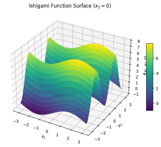 The Ishigami function lives in a three-dimensional input space (\(x_1, x_2, x_3 \in [-\pi, \pi]\)),
