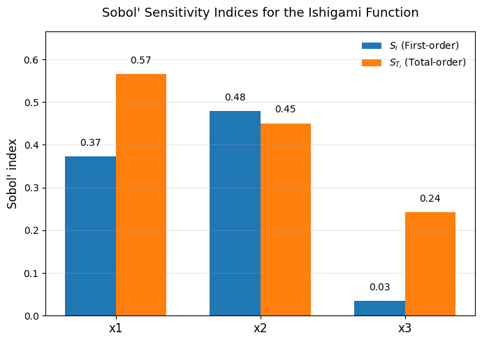 # Step 2.2: Visualizing first-order and total-order Sobol' indicesfig, ax = plt.subplots(figsize=(7,5))# set bar width and x positionsbar_width =0.35x = np.arange(len(sobol_df.index))# bars for S_first and S_totalax.bar(x - bar_width/2, sobol_df["S_first"], width=bar_width, label=r"$S_i$ (First-order)", color="#1f77b4")ax.bar(x + bar_width/2, sobol_df["S_total"], width=bar_width, label=r"$S_{T_i}$ (Total-order)", color="#ff7f0e")# axis and title formattingax.set_xticks(x)ax.set_xticklabels(sobol_df.index, fontsize=12)ax.set_ylabel("Sobol' index", fontsize=12)ax.set_title("Sobol' Sensitivity Indices for the Ishigami Function", fontsize=13, pad=15)ax.legend(frameon=False)# Add text labels above barsfor i inrange(len(x)): ax.text(x[i] - bar_width/2, sobol_df["S_first"].iloc[i] +0.02, f"{sobol_df['S_first'].iloc[i]:.2f}", ha='center', va='bottom', fontsize=10, color='black') ax.text(x[i] + bar_width/2, sobol_df["S_total"].iloc[i] +0.02, f"{sobol_df['S_total'].iloc[i]:.2f}", ha='center', va='bottom', fontsize=10, color='black')ax.set_ylim(0, max(sobol_df["S_total"].max(), sobol_df["S_first"].max()) +0.1)ax.grid(axis='y', alpha=0.3)plt.tight_layout()plt.show()